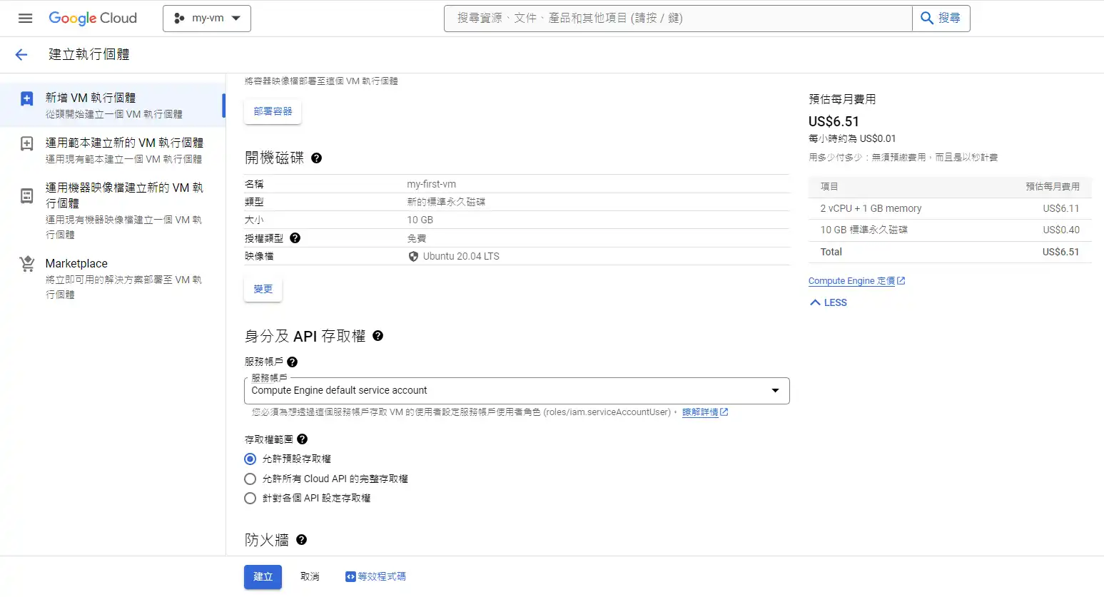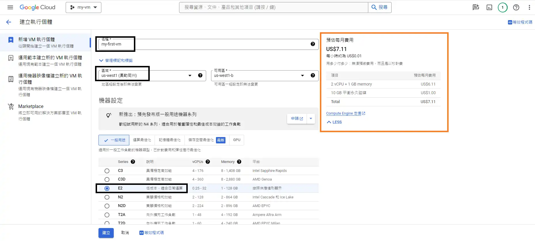 右邊橘色框框會根據你所選的虛擬主機配置實時更新,可以用那個大略估計你的預算,當然那只是預估而已! gcp計費是用多少付多少的機制