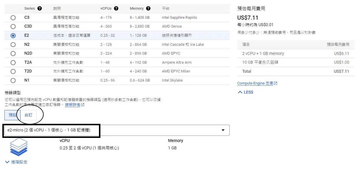 然後往下,這邊會發現有自訂的選項,CPU和記憶體都可以根據自己的需要去設定,這邊我們直接使用配置好的e2-micro