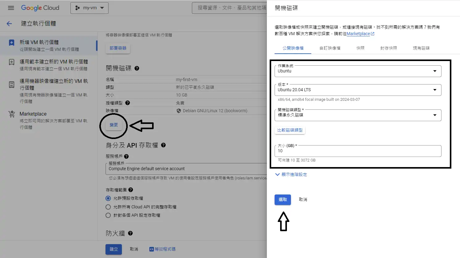 這邊點選 變更,然後我選ubuntu和標準永久磁碟,這邊也是根據自己的需求調整(google很好心的還有附上磁碟類型的比較),想要直接選SSD或極端也可以