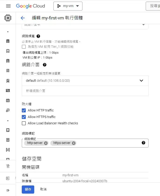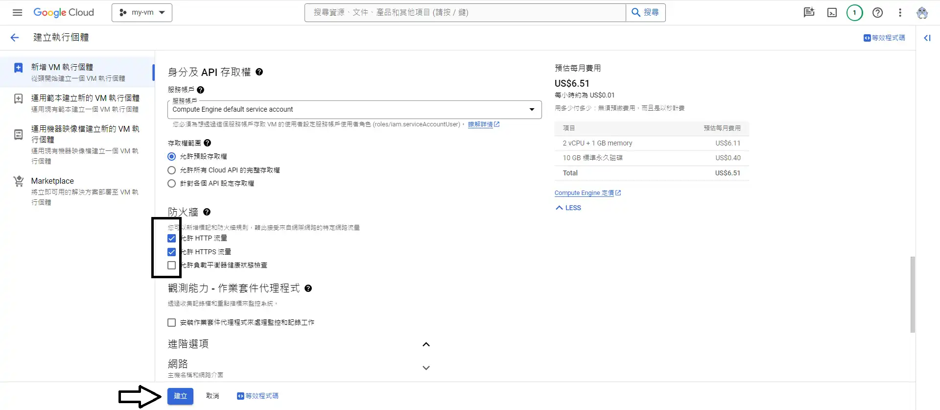 再來往下到防火牆的部分,如果你是想要架設網站,要讓其他人訪問你的網站,要把http和https打勾,這樣gcp會在你確定建立VM的時候,一併幫你把端口(port)80和443打開