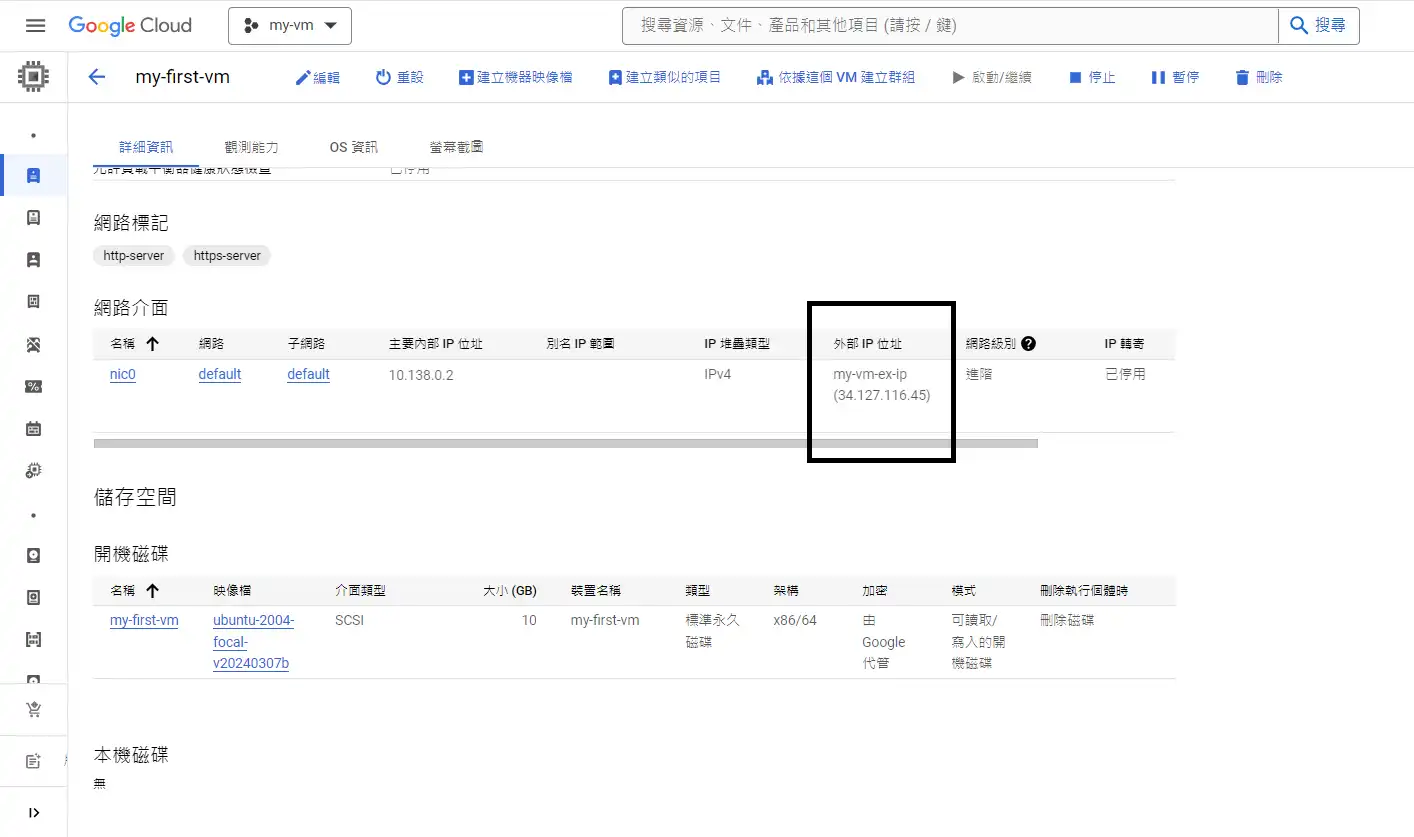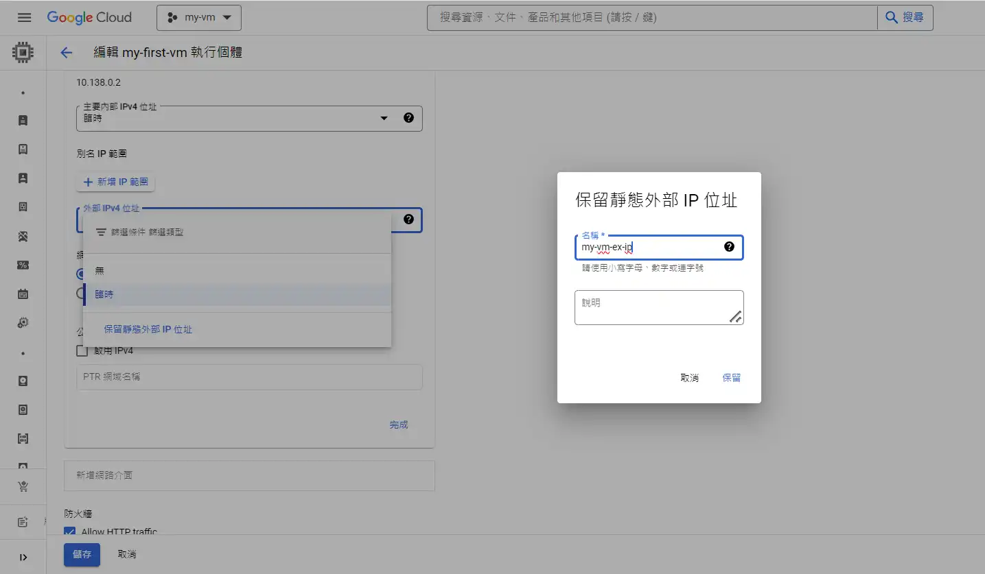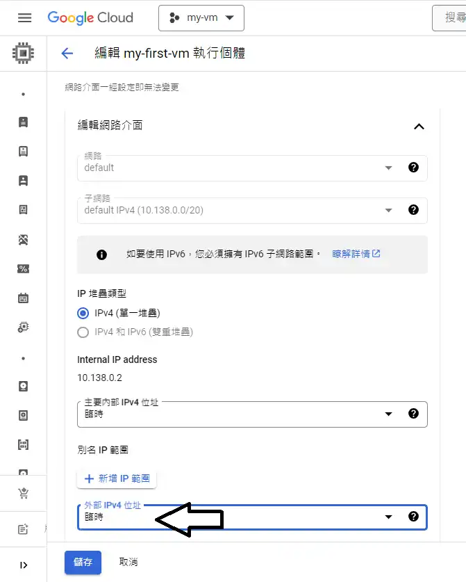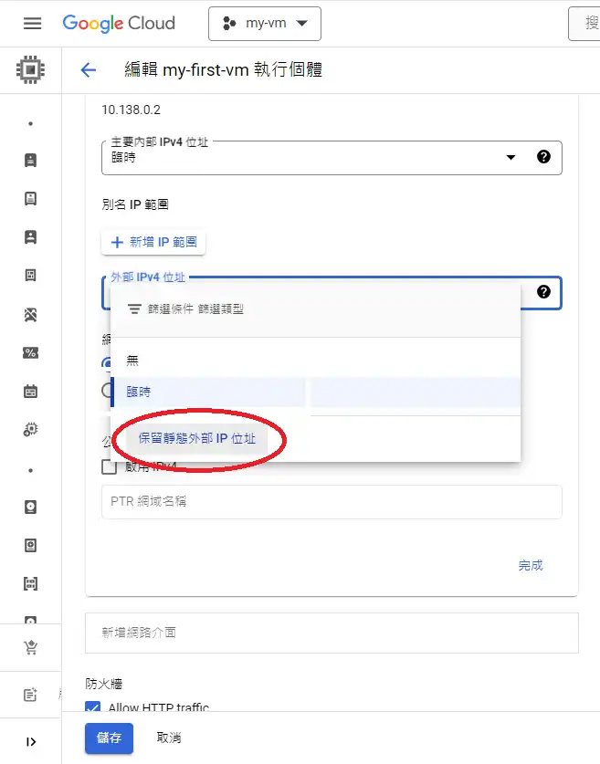 儲存對主機的變更,之後跳出來,看到的外部IP就已經是靜態的IP了,重新開機也不會變動