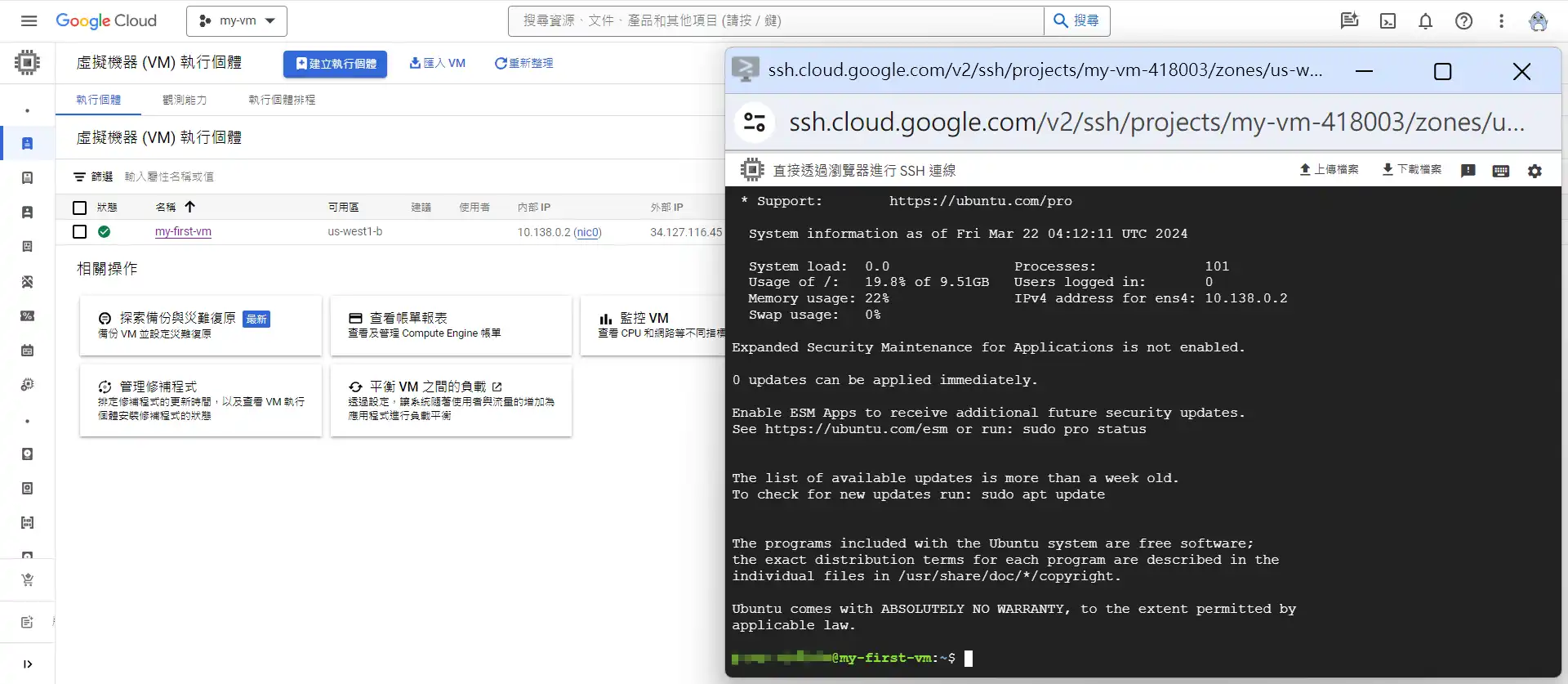 這邊用最直接的方式,透過gcp的SSH按鈕進入,點 在瀏覽器視窗中開啟
